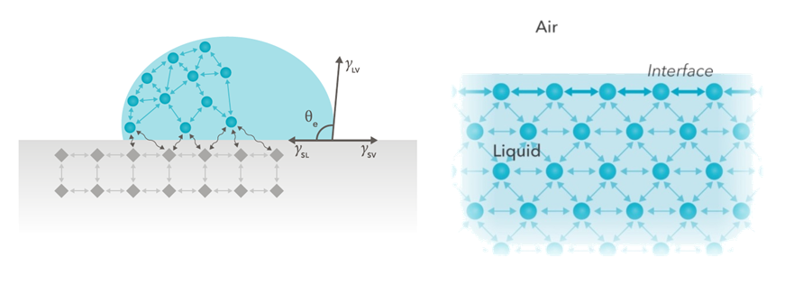 Figure 1. Forces at an interface originate from the fact that the molecules interact differently with surrounding molecules at the interface than those in the bulk.